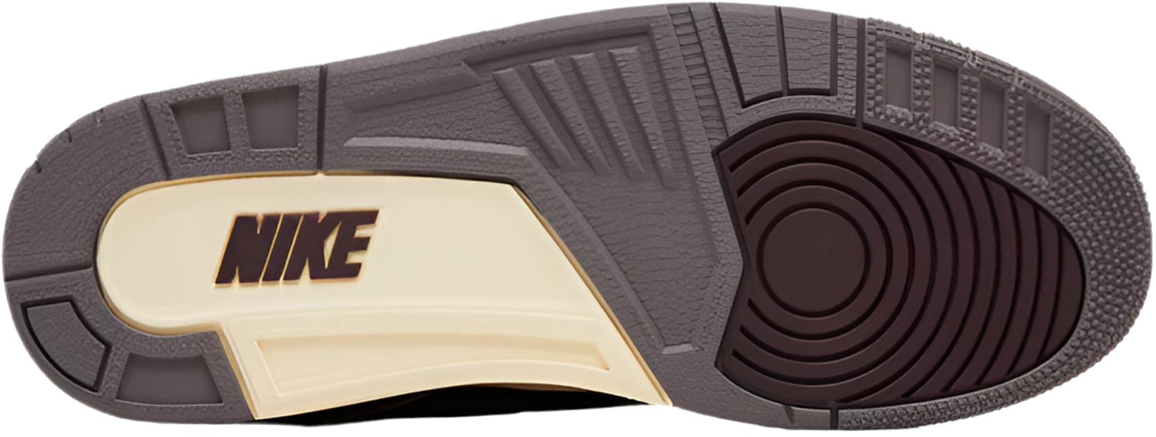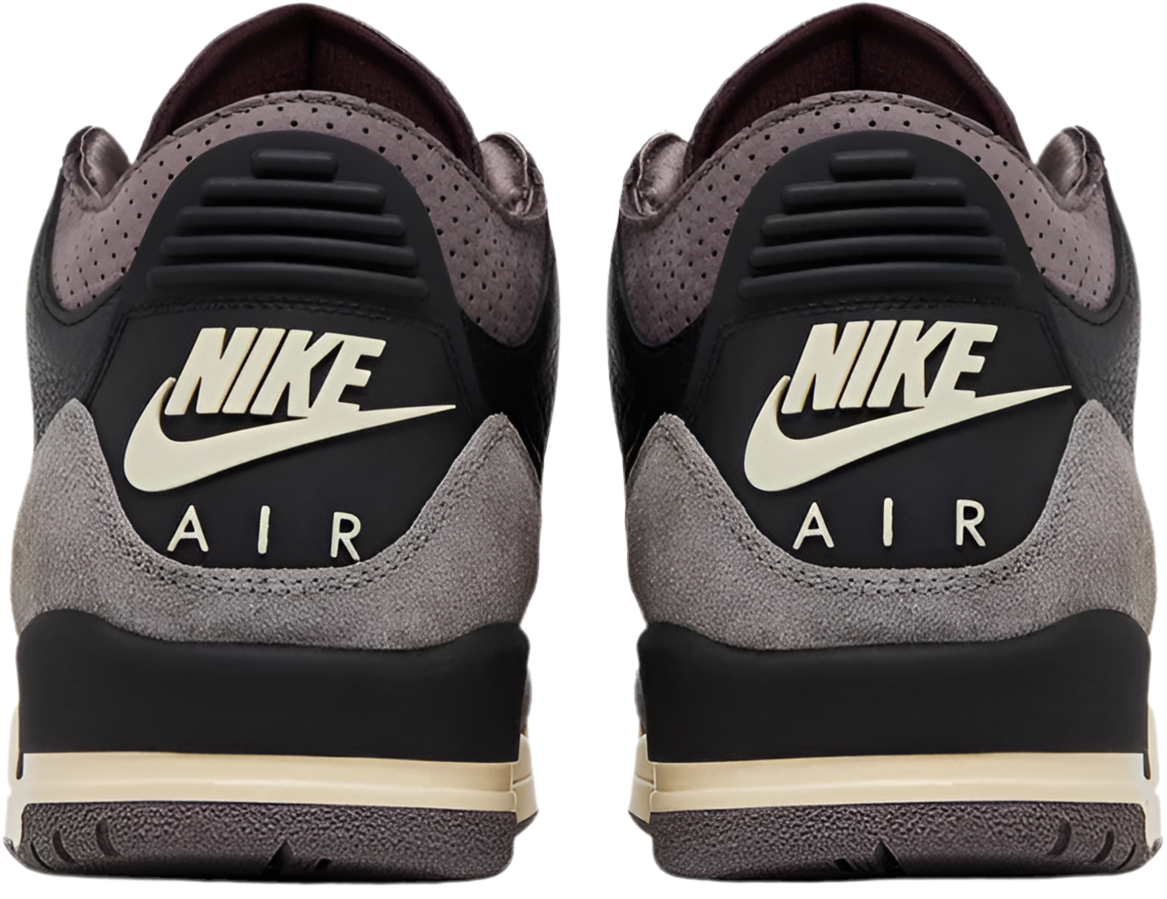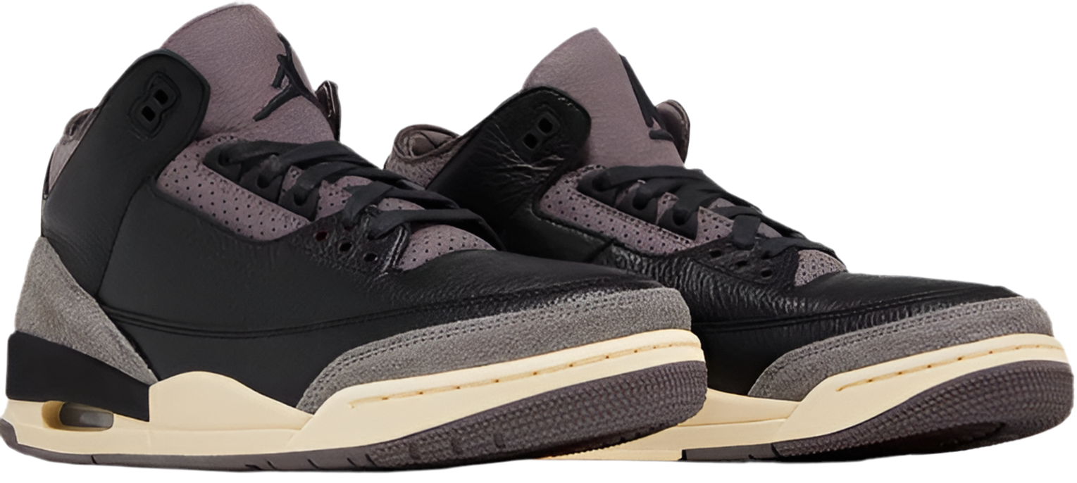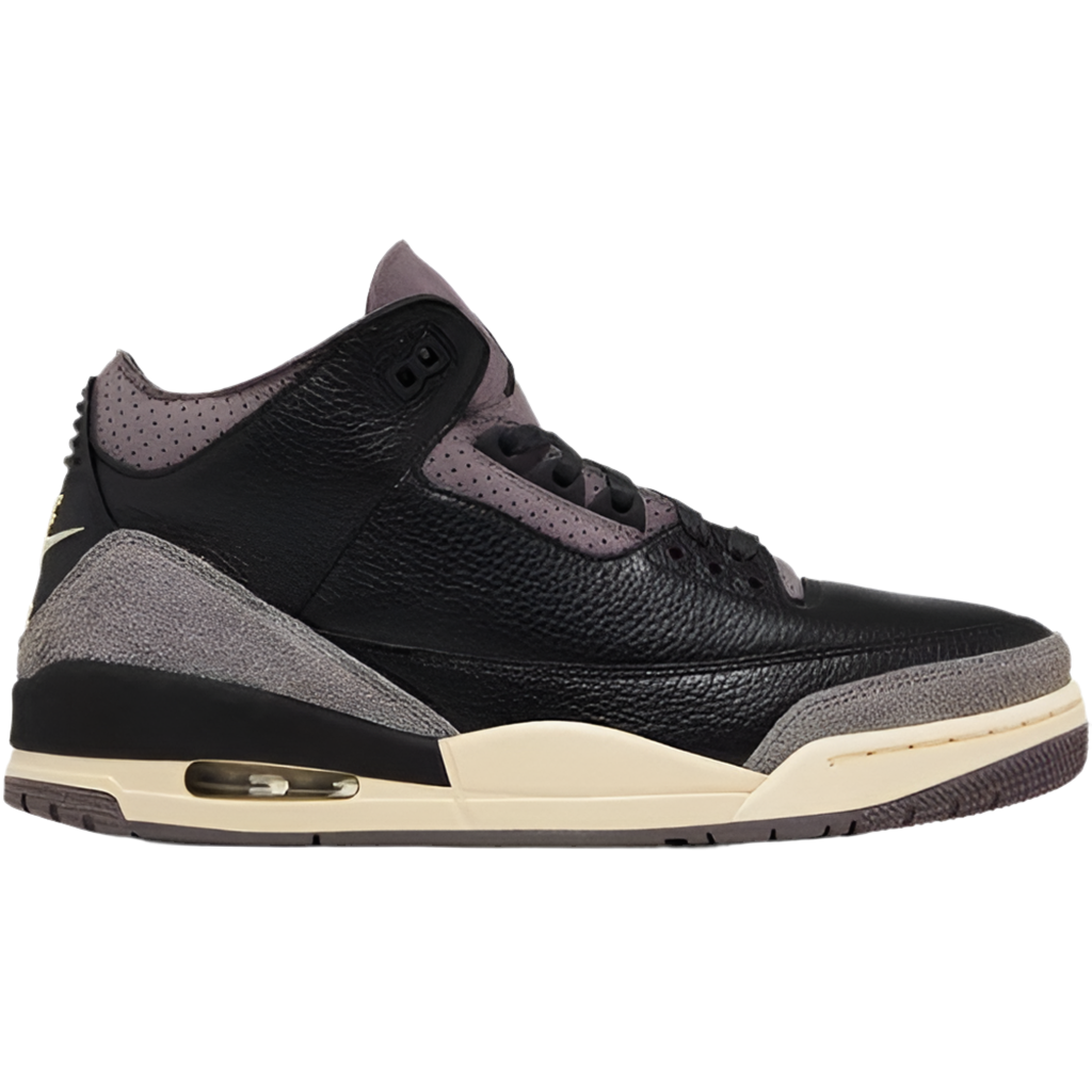The A Ma Maniére x Women's Air Jordan 3 Retro 'While You Were Sleeping' features black tumbled leather on the upper, fortified with grey hairy suede overlays at the forefoot and heel. Perforated nubuck in a subdued Violet Ore hue appears on the eyestay and mid-cut collar, lined with quilted satin and stripped of interior padding. The tongue is similarly slimmed down and displays mismatched 'A' and Jumpman branding. A raised Nike Air logo embellishes the molded heel tab. A vintage off-white finish coats the polyurethane midsole, fitted with a visible Air-sole unit in the heel.