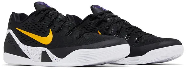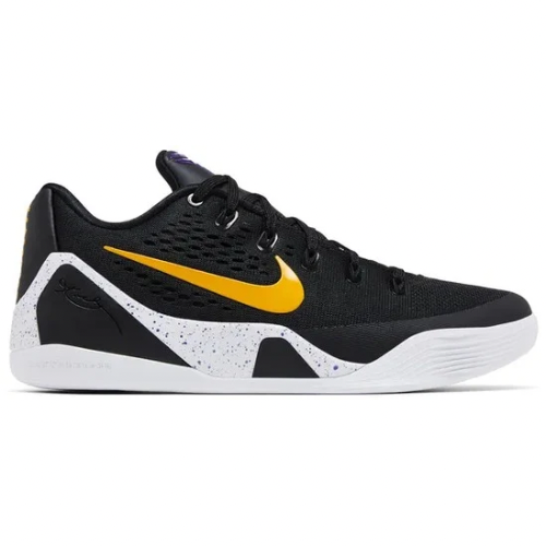 Releasing as part of a 'Team Bank' collection, the Nike Kobe 9 EM Protro TB 'Lakers Away' outfits the low-top in a black engineered mesh upper. A metallic gold Swoosh shines on the quarter pane, while Kobe Bryant's purple sheath logo adorns the tongue. A speckled midsole houses a drop-in React foam insert, replacing the Lunarlon cushioning of the original Kobe 9.