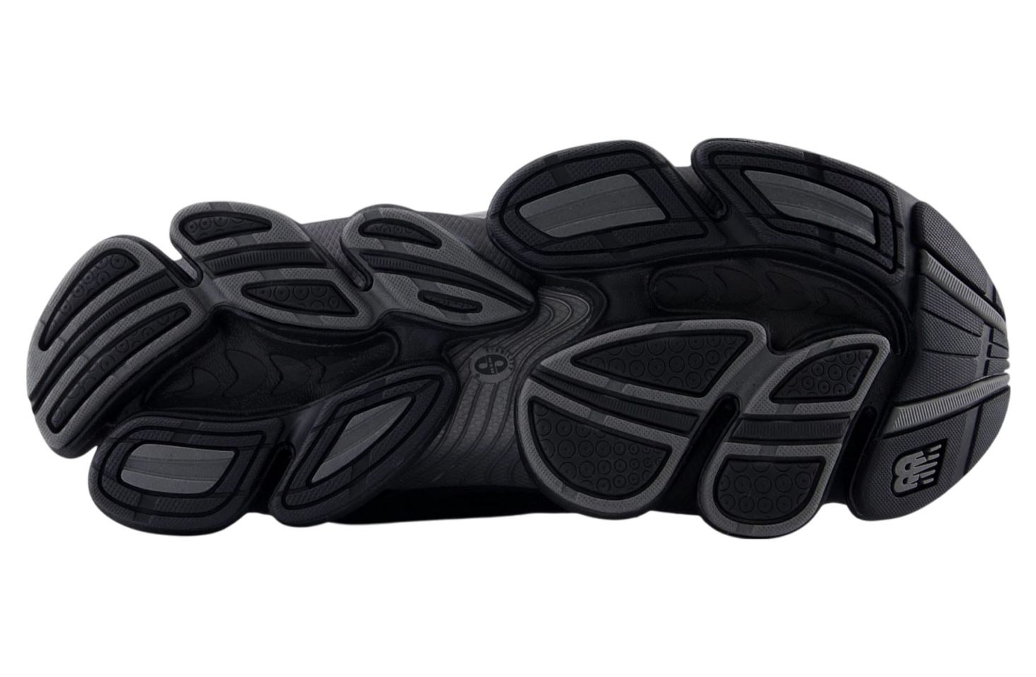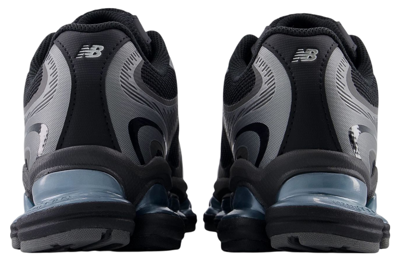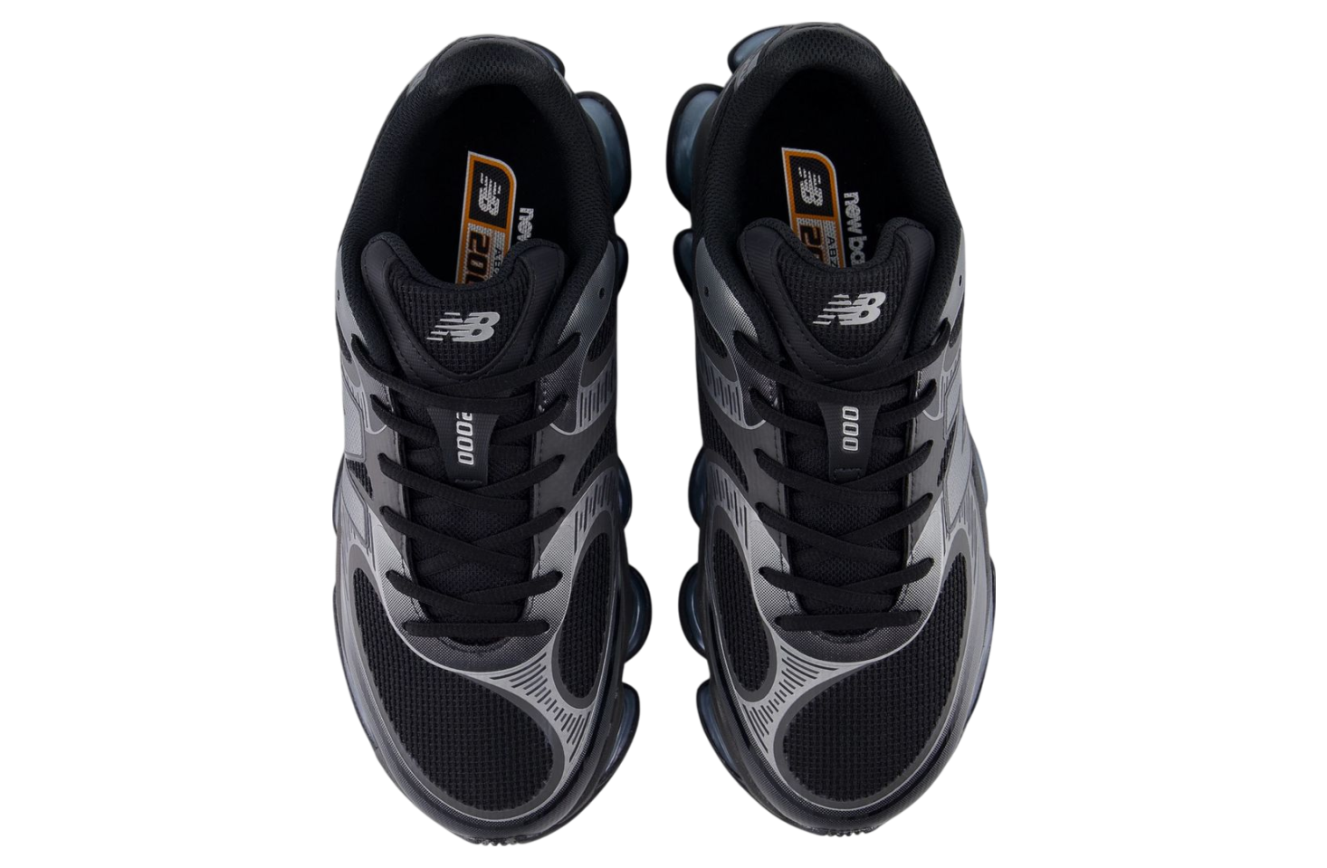 The New Balance ABZORB 2000 'Black Dark Silver' combines woven black mesh with no-sew synthetic overlays in a greyscale finish. The sneaker sits atop a full-length ABZORB midsole, painted black and fitted with blue-tinged ABZORB SBS pods. Underfoot, the segmented rubber outsole reveals New Balance's Stability Web for improved arch support.